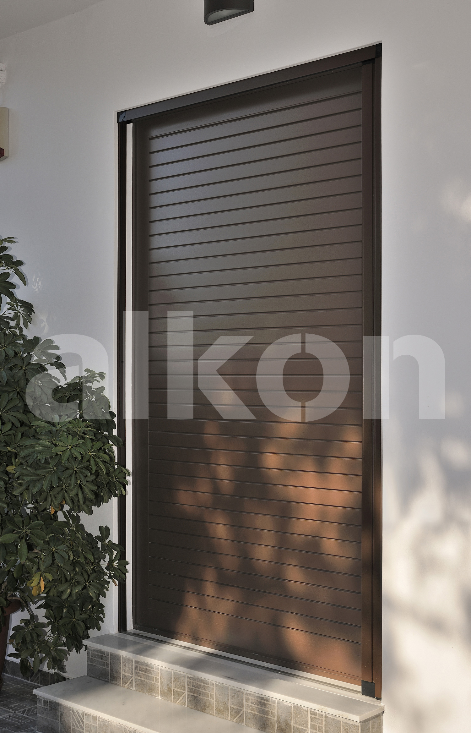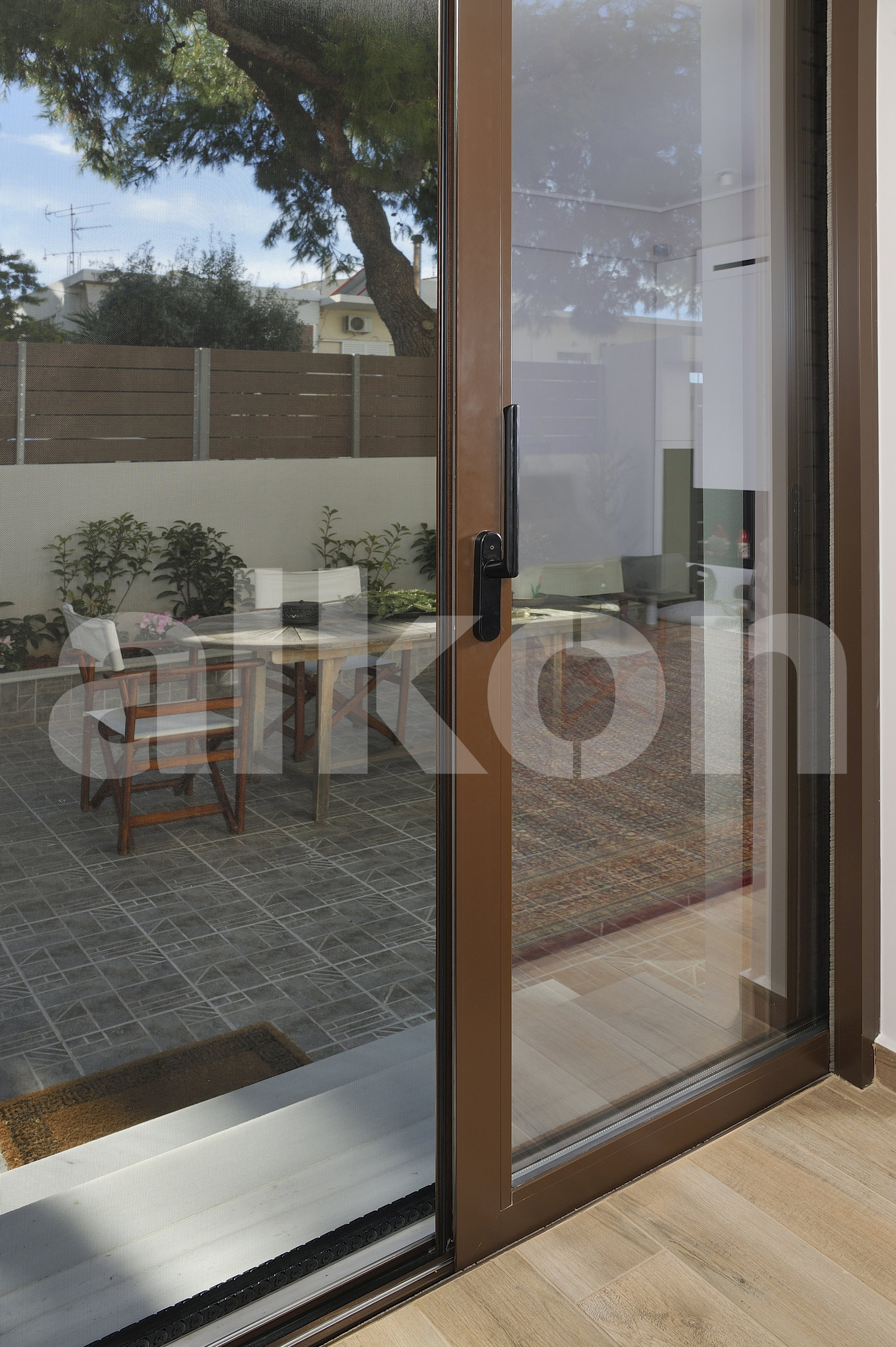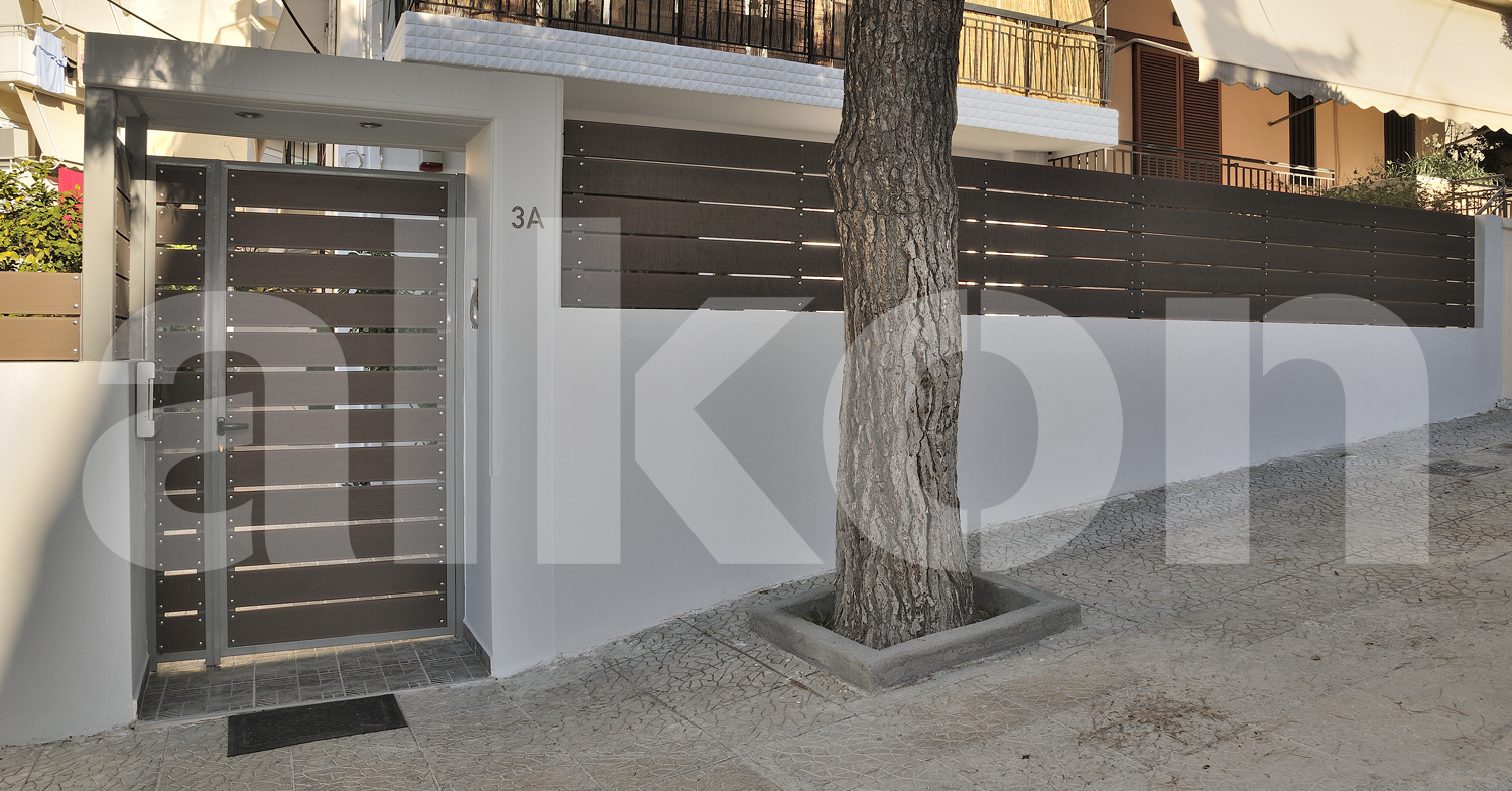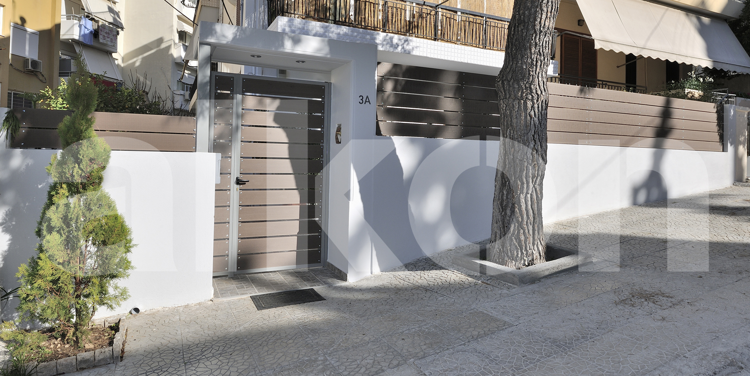 Home in Helioupolis alkon manufactured and installed: Retractable energy aluminium frames in matt brown colour Tracked aluminium mesh screens Metal structures synthetic deck gate and compound fencing