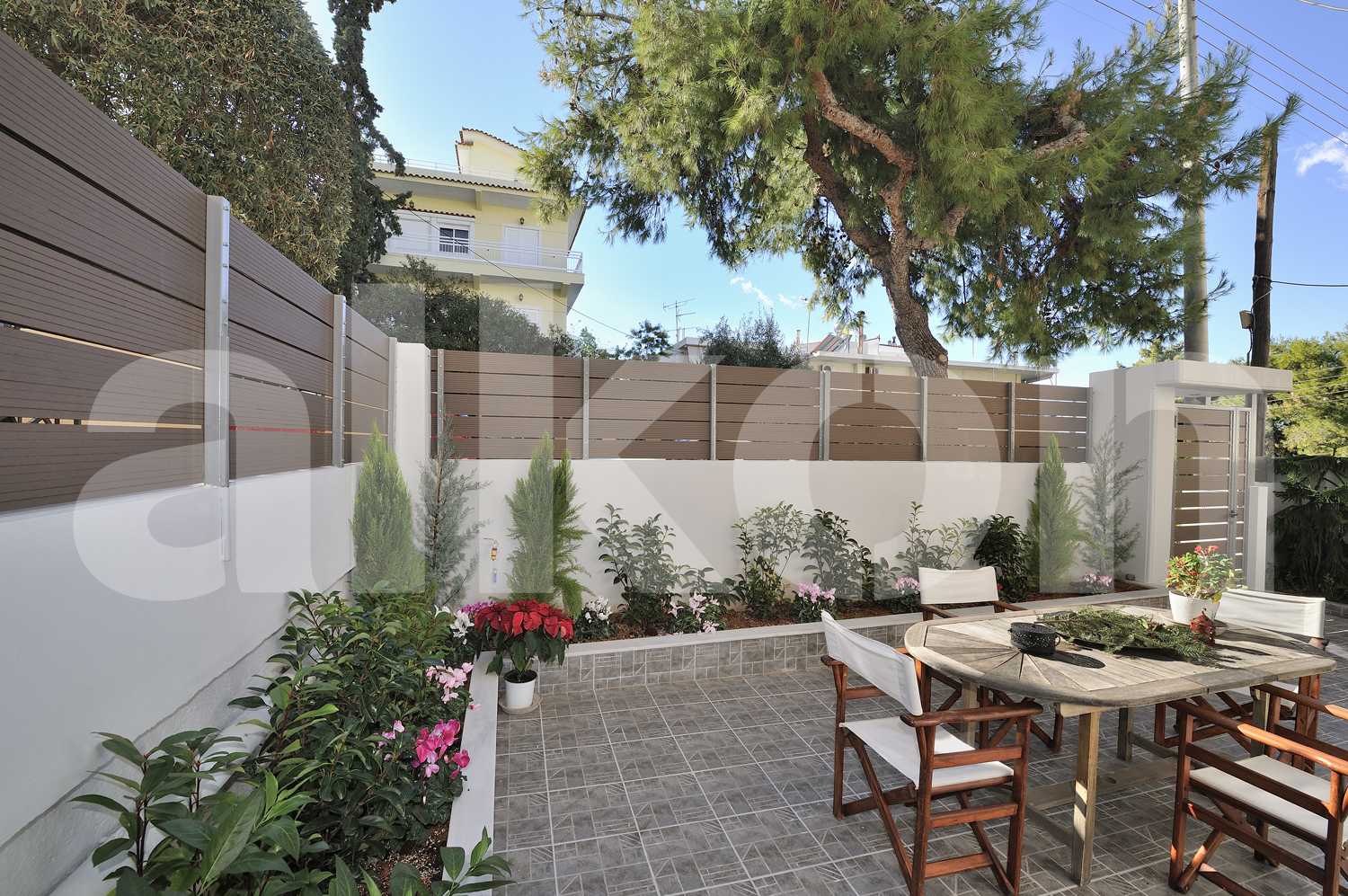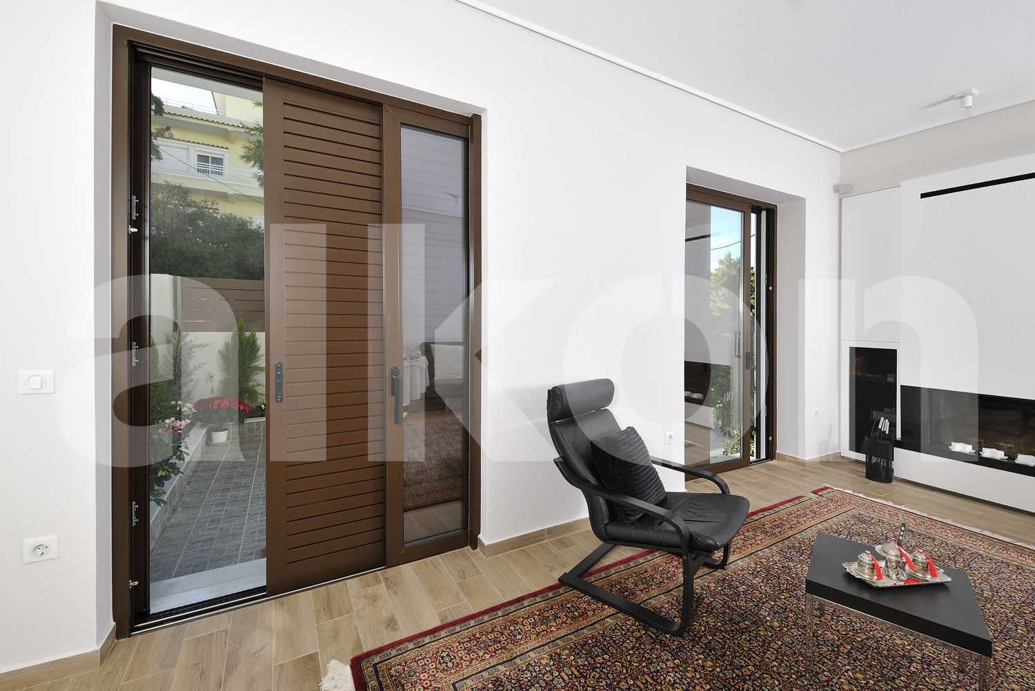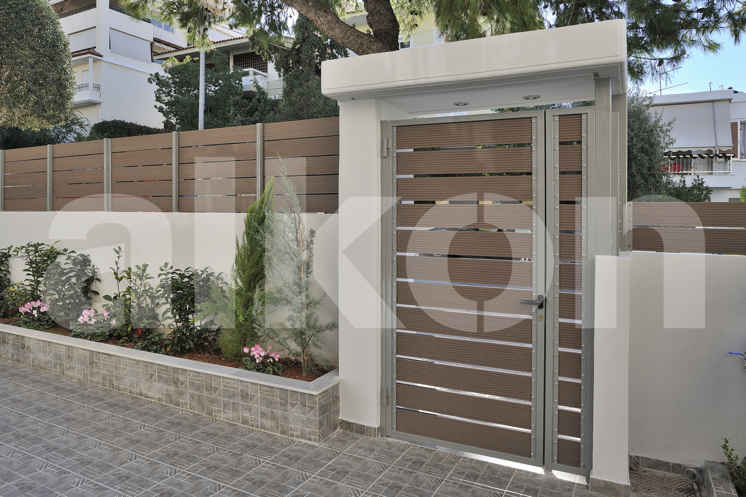 Home in Helioupolis alkon manufactured and installed: Retractable energy aluminium frames in matt brown colour Tracked aluminium mesh screens Metal structures synthetic deck gate and compound fencing