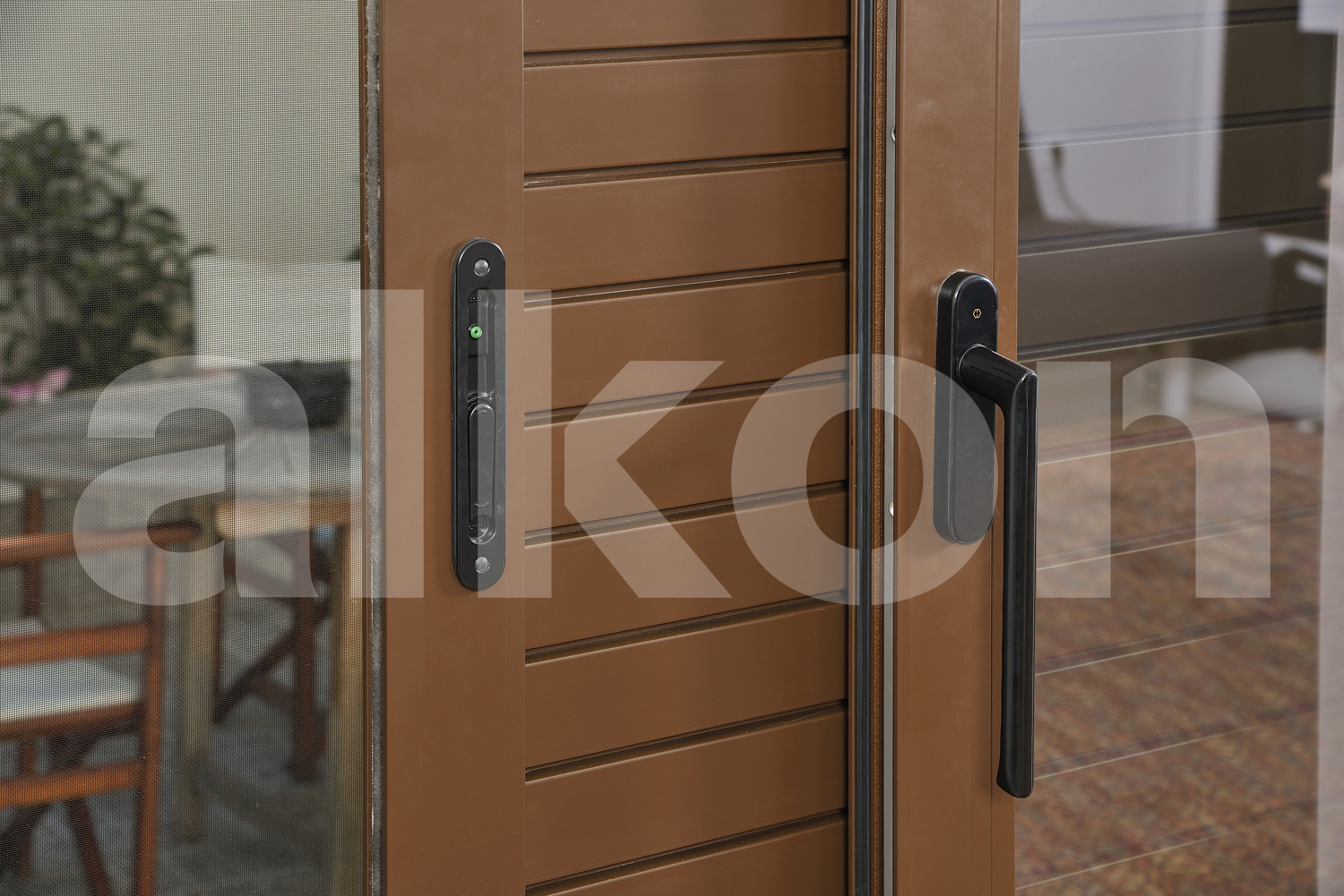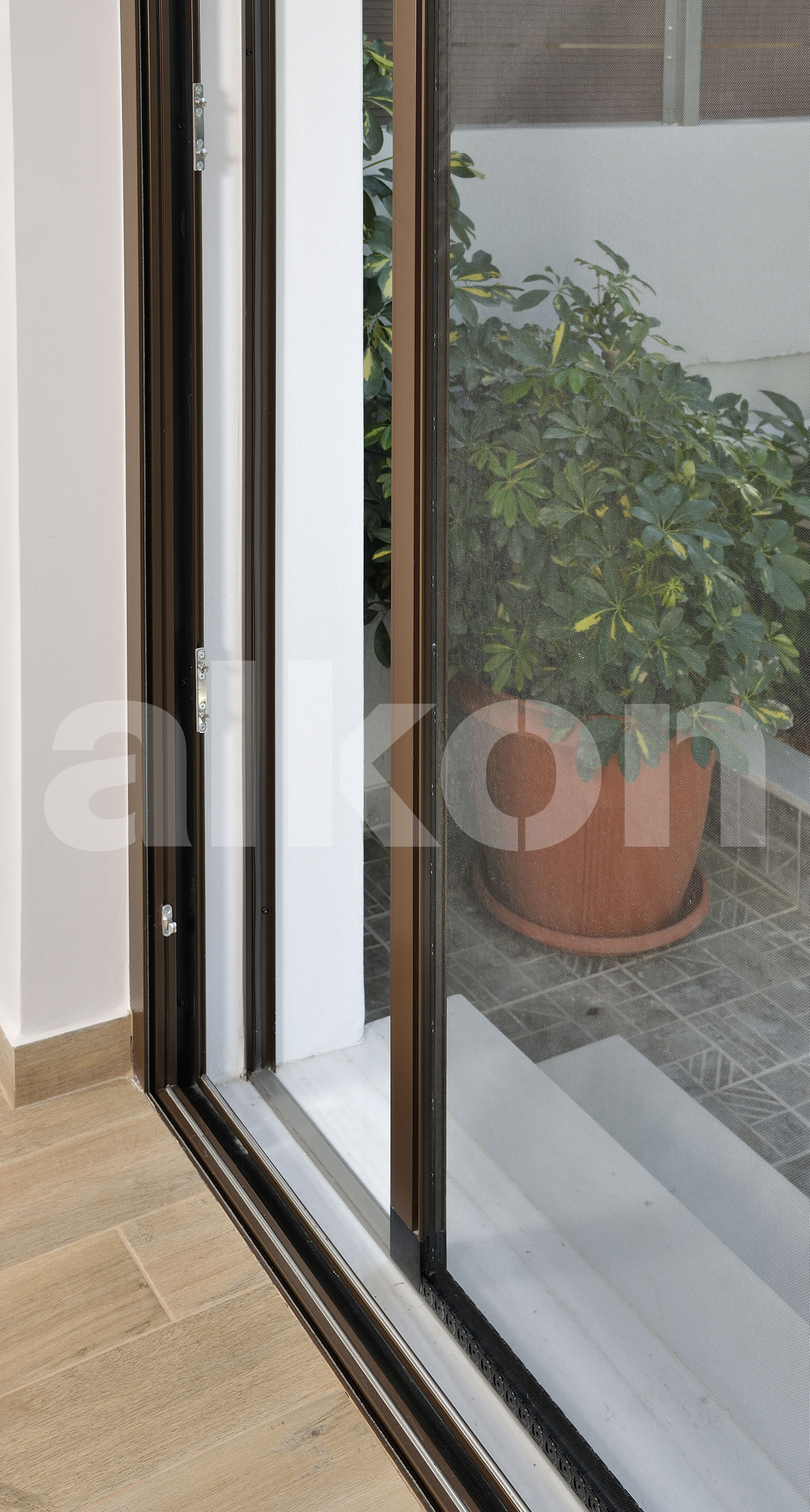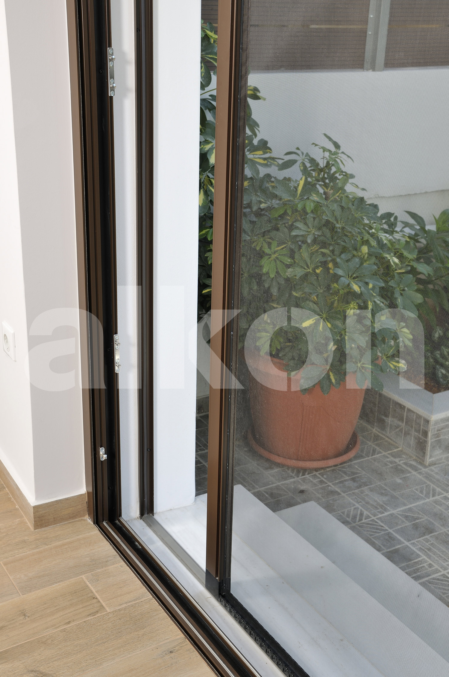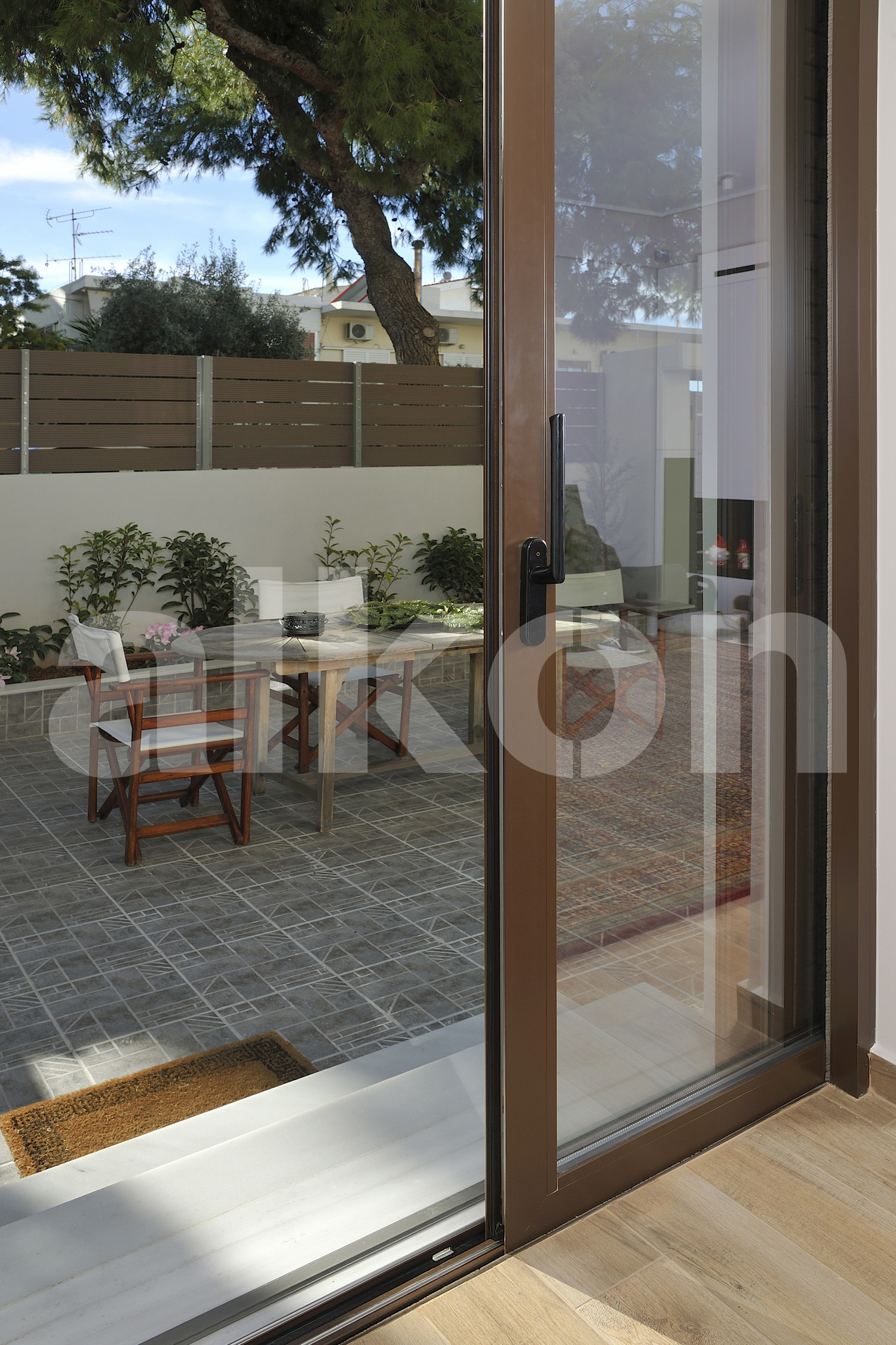 Home in Helioupolis alkon manufactured and installed: Retractable energy aluminium frames in matt brown colour Tracked aluminium mesh screens Metal structures synthetic deck gate and compound fencing