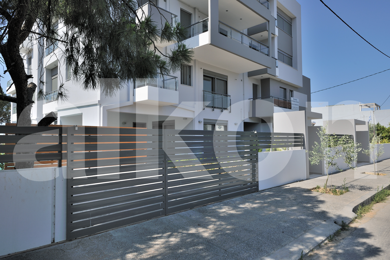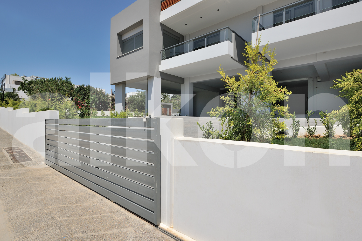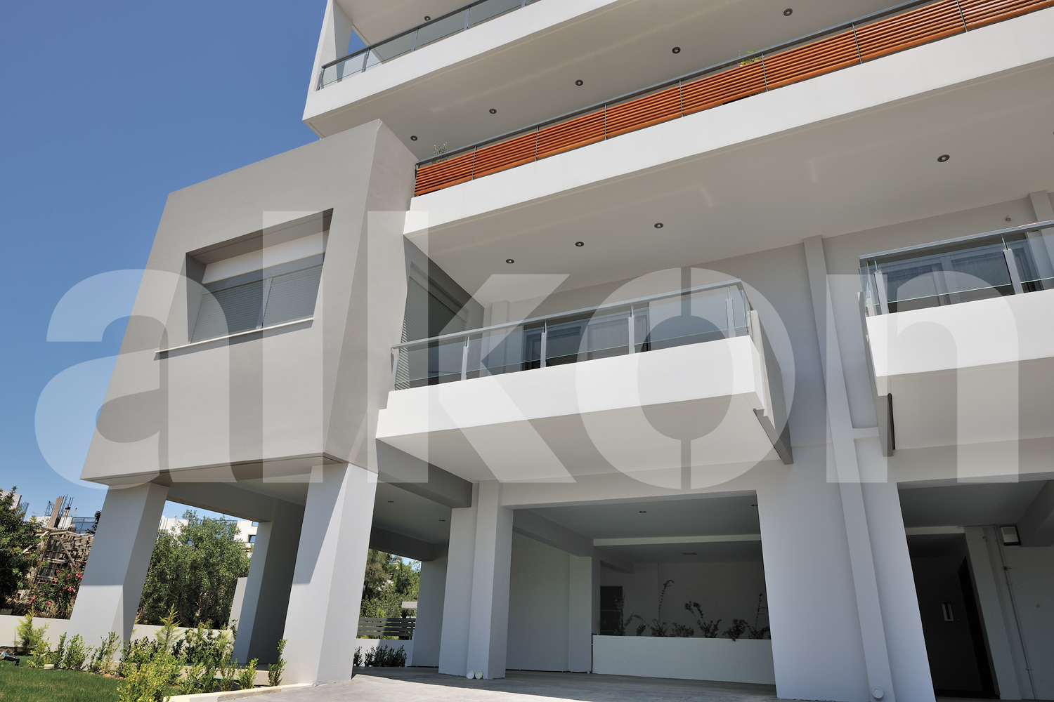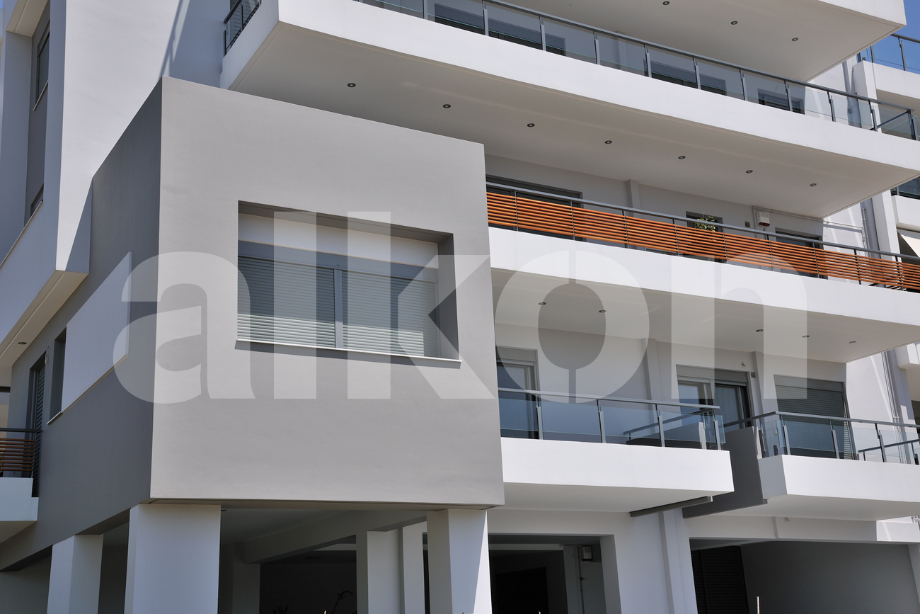 Block of flats in Alimos alkon manufactured and installed: Aluminium frames in ral grey colour Electric aluminium roller shutters with polyurethane louvers Iron structures – opening & sliding doors – balcony railings – Garden fencing